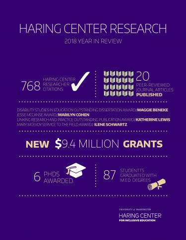 Two more Haring Center researchers were recognized for work published in 2018. Maggie Beneke, Ph.D., won the American Educational Research Association’s Disability Studies in Education Outstanding Dissertation Award for her dissertation “Race and Ability Talk in Early Childhood: Critical Inquiry into Shared Book Reading Practices with Pre-service Teachers.” Katherine Lewis, Ph.D., was awarded the Linking Research and Practice Outstanding Publication Award by the National Council of Teachers of Mathematics Research Committee for her co-authored study “Productive Struggle for All: Differentiated Instruction.”