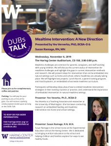 Wednesday, November 6, 2019 The Haring Center Auditorium, CD 150, 2:00-3:00 p.m. Mealtime challenges are common for parents, caregivers, and staff working with young children. We will discuss the current status of intervention for mealtime challenges and highlight the gaps in current intervention methods and research. We will present ideas for intervention that can be embedded into natural settings such as home and school, where mealtimes are already taking place. We will highlight two projects: Lunch Bunch, a parent training…